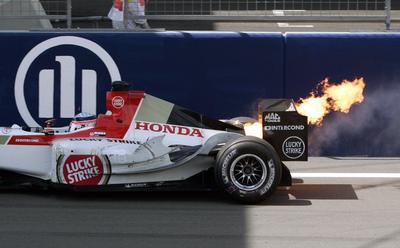 Der Rennwagen des japanischen Formel 1-Piloten Takuma Sato (BAR-Honda) brennt am Sonntag (30.05.2004) auf der Formel 1-Rennstrecke am Nürburgring nach einem Motorschaden beim Großen Preis von Europa auf der Startgeraden.
