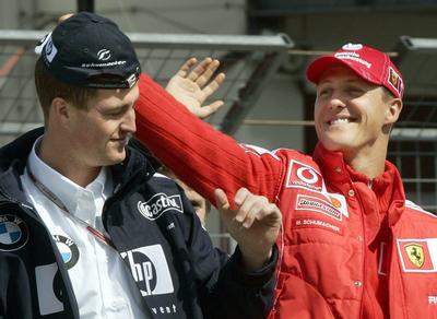 Der deutsche Formel 1-Weltmeister Michael Schumacher (r) von Ferrari klaut seinem Bruder Ralf (BMW-Williams) am Sonntag (30.05.2004) auf der Formel 1-Rennstrecke am Nürburgring bei der Fahrerparade vor dem Großen Preis von Europa die Schirmmütze vom Kopf. |