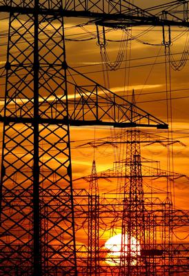 Die Sonne geht am Samstag (29.05.2004) in Wesseling bei Köln hinter Strommasten unter. Vom 01.06.2004 bis 04.06.2004 findet in Bonn die Internationale Konferenz für erneuerbare Energien statt.