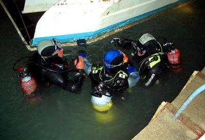 Feuerwehrtaucher im Einsatz bei dem verunglueckten Boot in der Seegrotte Hinterbruehl am Montag, 31. Mai 2004. Beim Einsteigen kenterte das mit 33 Personen besetzte Ausflugboot, fuenf Meschen starben bei dem Unfall.