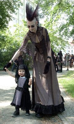 In „angemessener“ Kleidung wird die elf Monate alte Zora von ihrer Mutter Katja Schiller aus Göppingen (Baden-Württemberg) während des 13. Wave-Gotik-Treffens am Sonntag (30.05.2004) in Leipzig ausgeführt. Rund 20.000 Freunde düsterer Musik und schwarzer Kleidung weilten über Pfingsten zu dem Treffen in Leipzig. 155 Künstler und Gruppen aus vielen Teilen der Welt bestritten das am 31. Mai zu Ende gegangene Festival. |